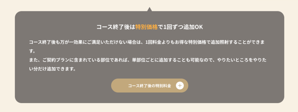 プランを終了してまた仮に気になる部位がでてきた時も、気軽に照射を何度でも受けることができるのは医療脱毛する上で非常にありがたいポイントですね。