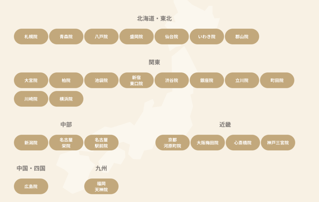 リゼクリニックの店舗があるのは以下の地域です。